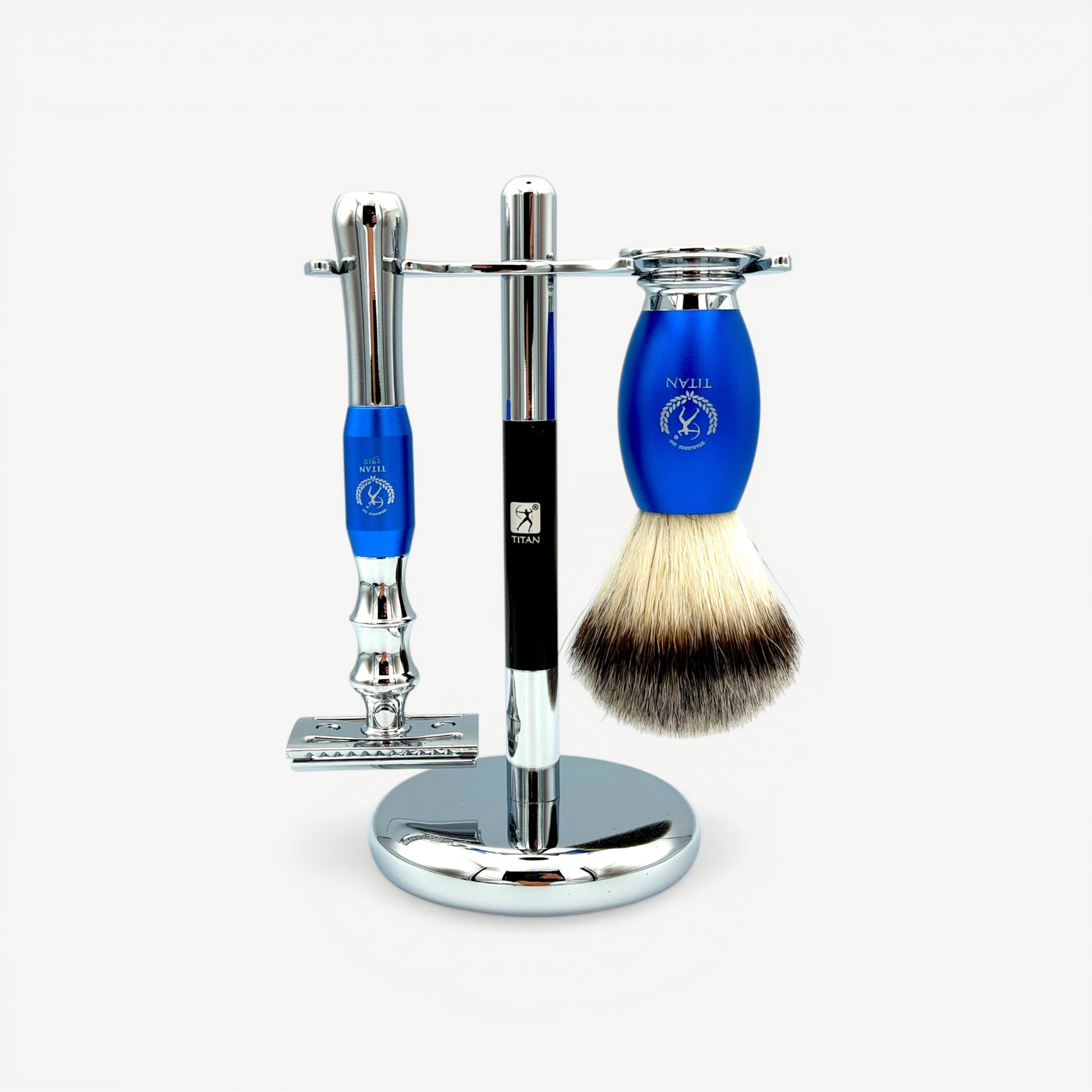 Upgrade your grooming routine with the Titan Beard Grooming Kit Blue, a complete shaving set designed for a smooth, precise, and professional shaving experience.This classic wet shaving set includes a safety razor and shaving brush, helping to lift and soften beard hair while creating a rich lather for a closer and more comfortable shave.